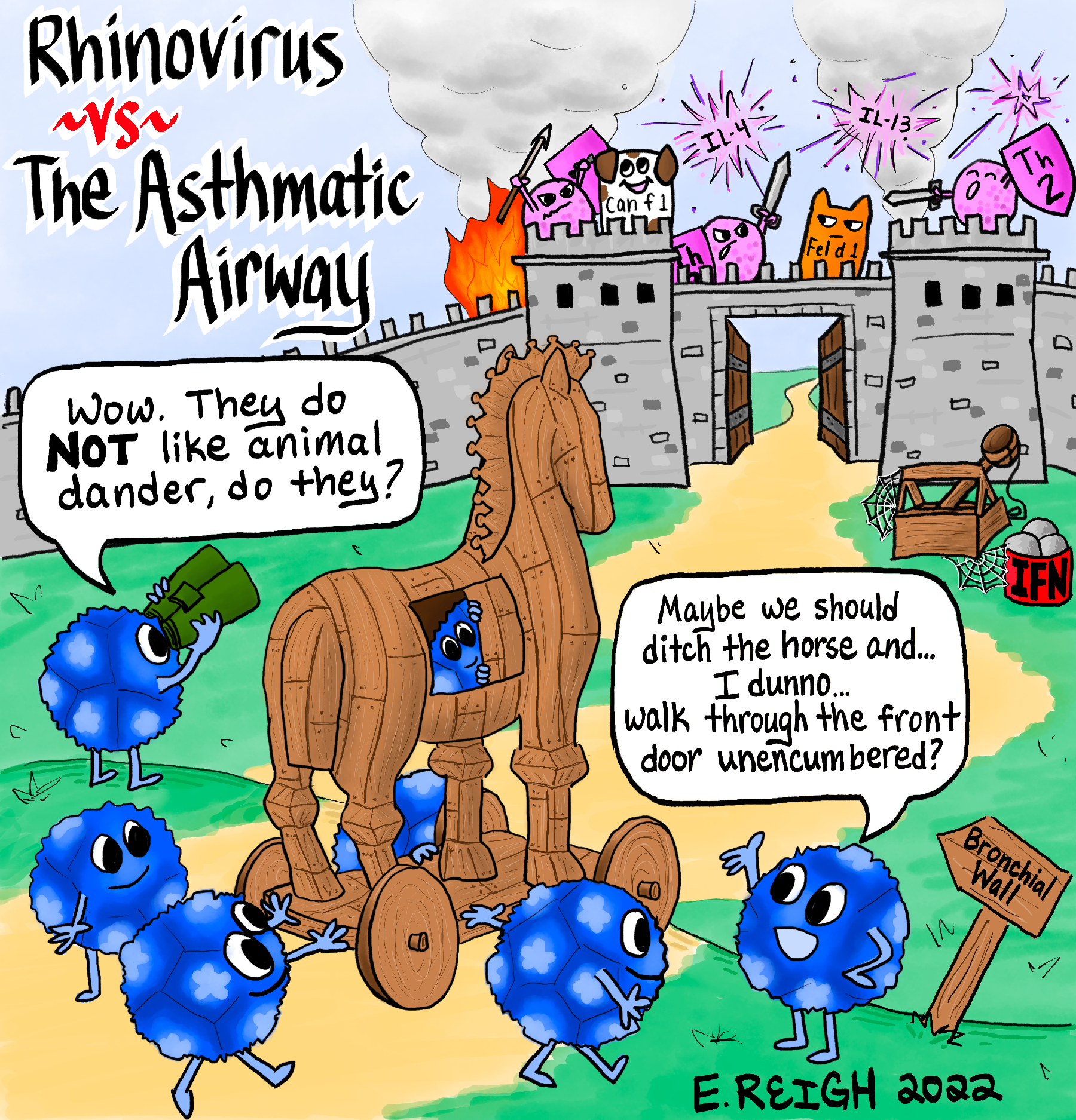 Asthma is a disease that leads to recurrent tightening of the airways (wheezing) and difficulty breathing. Rhinovirus is best known for being a cause of the common cold, but in patients with asthma, it can lead to severe flare ups of wheezing, which may require hospitalization. Studies show that patients with allergies are more likely to get an asthma flare from rhinovirus. Simply put, their immune system is too busy attacking allergens to respond well to rhinovirus, so it is able to cause a more severe infection.